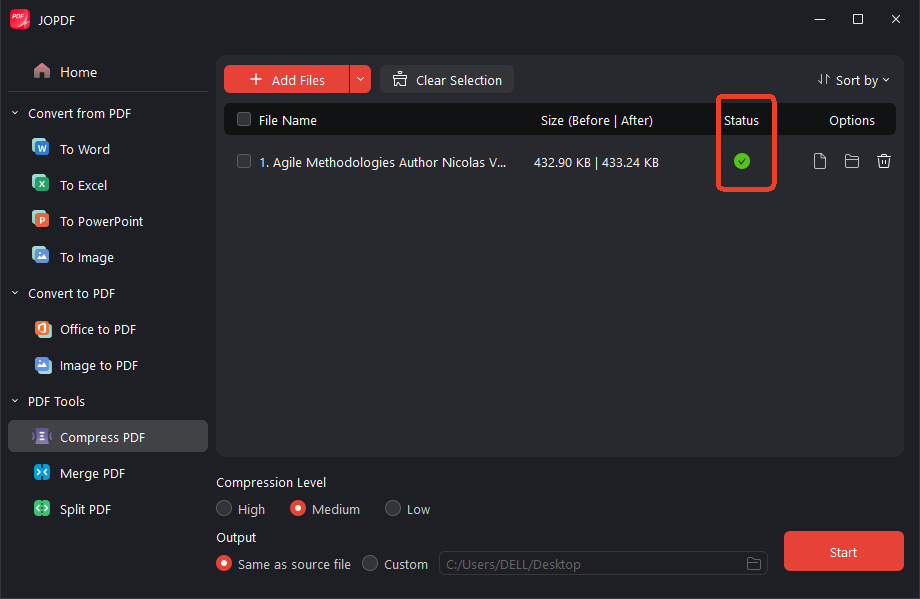 Open JOPDF and click “Compress PDF”. Select the PDF file you want to compress.