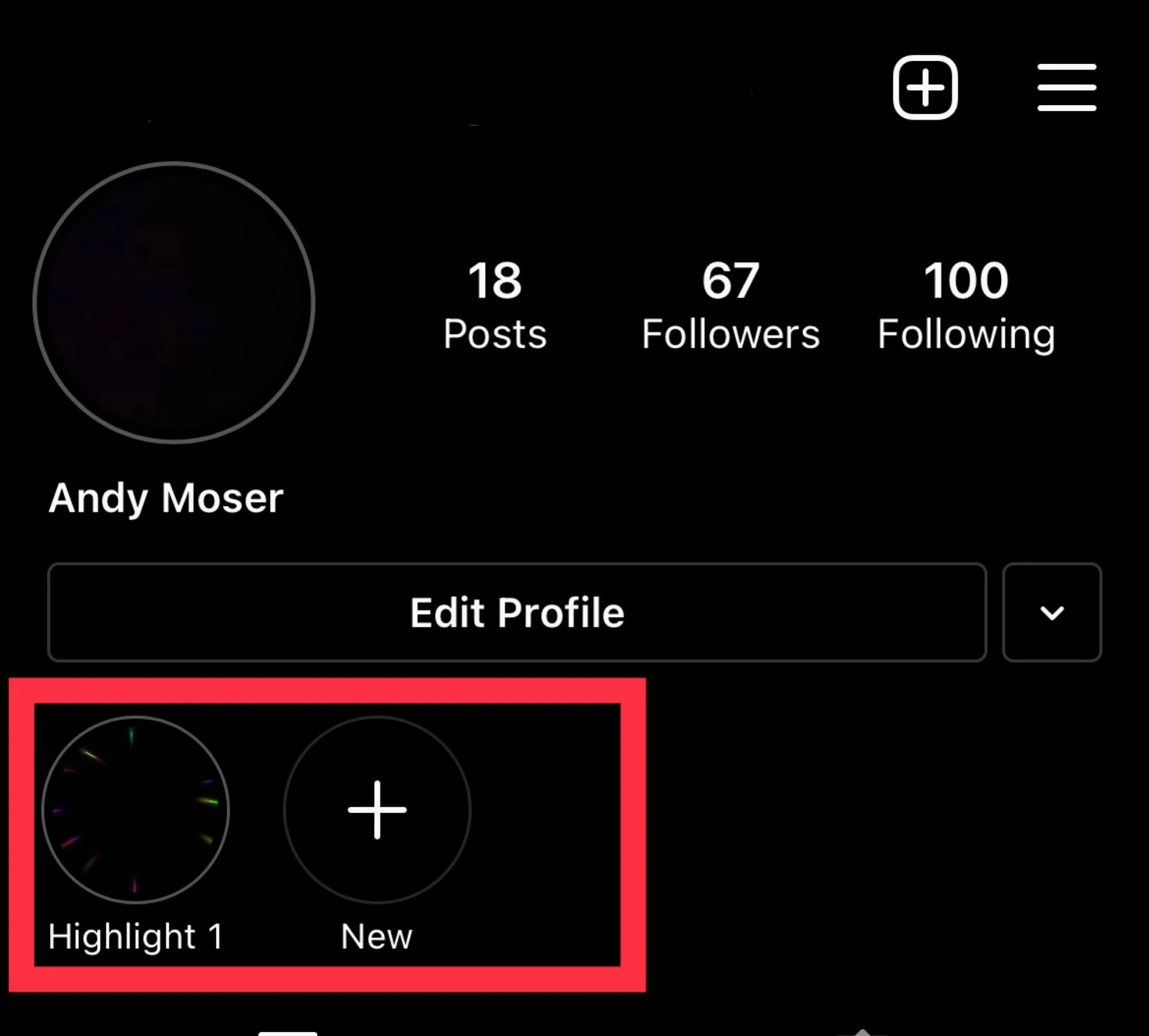 Tap the “+” (New) circle under your bio in the Highlights section.